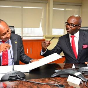 Nollywood Actor and Movie Producer; Jim Iyke (M) signing a partnership contract with Bossbus brand executives; CEO, Bossbus; Oluwatobi Johnson Fakayode (L) and Chairman, Board of Directors, Bossbus; Felix Achibirim (R) at a Bossbus press conference in Lagos yesterday.