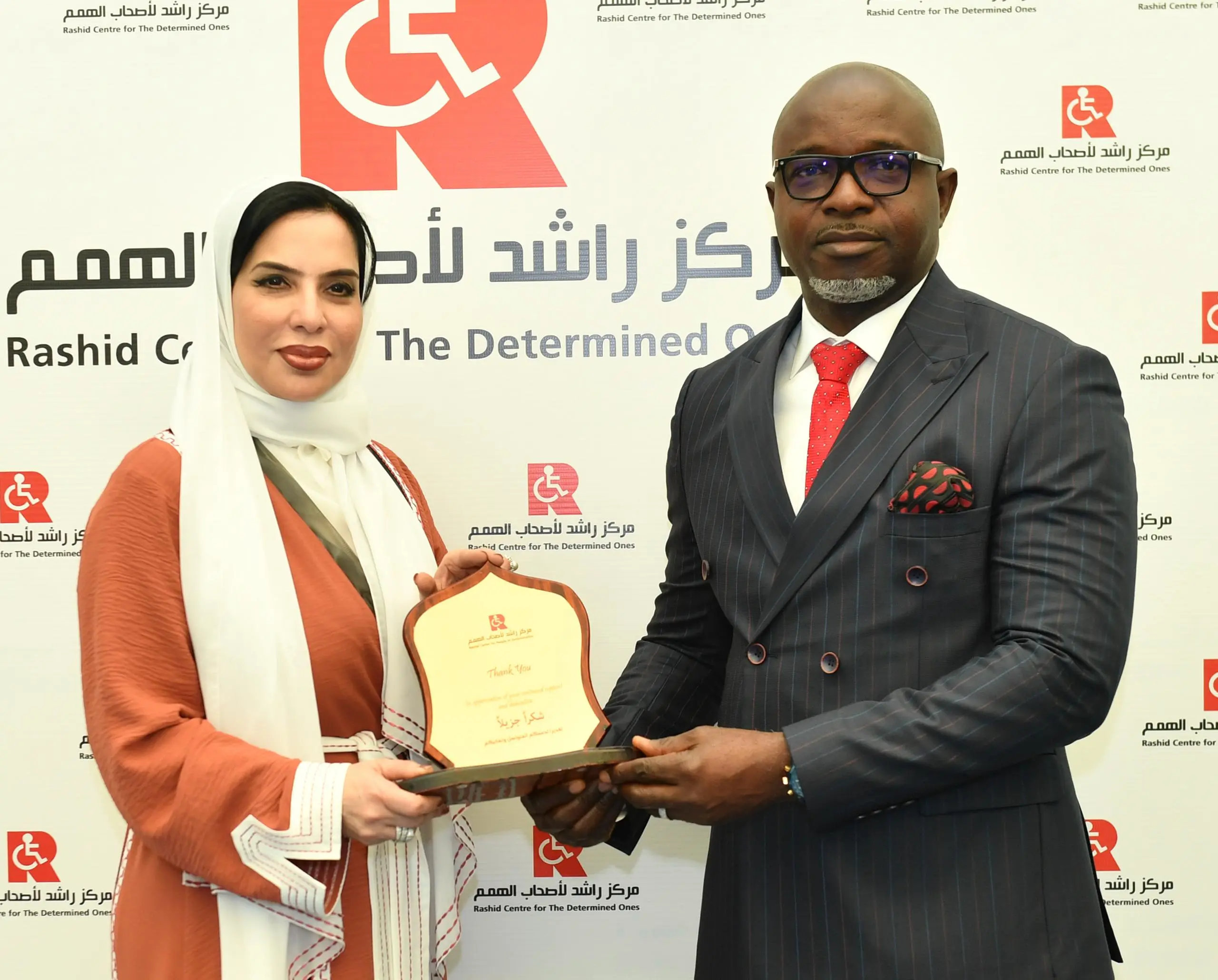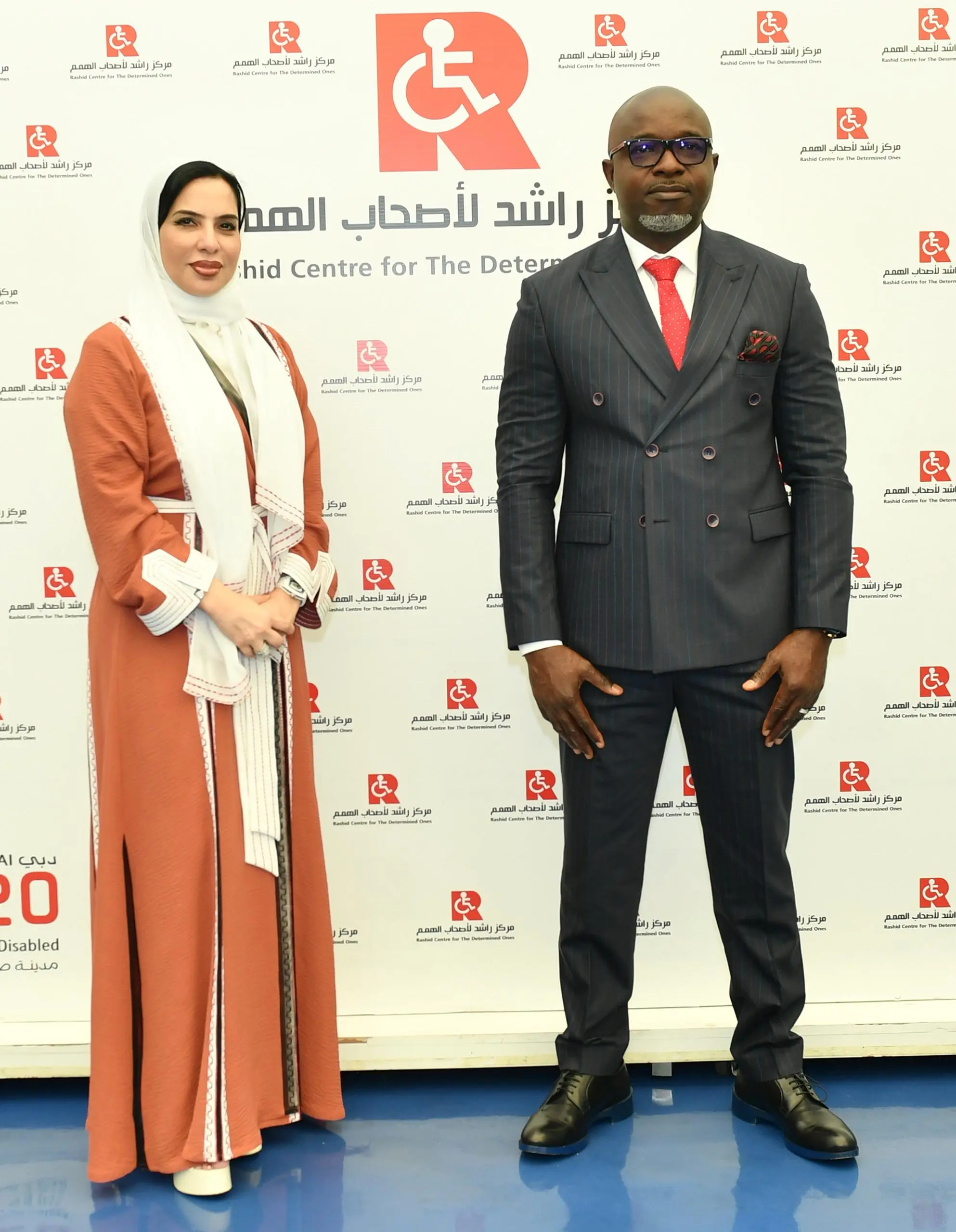 Mariam Othman, CEO of the Rashid Centre, with Mr. Felix Achibiri at the Rashid Centre for People of Determination, strengthening partnerships to promote inclusion and empowerment for people of determination.